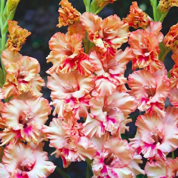Луковицы гладиолуса гибридного Kissy Ruffle позволят вырастить потрясающие колосовидные соцветия, состоящие из крупных гофрированных цветов с лососевыми лепестками. Высота взрослого растения варьируется от 90 до 110 сантиметров. Кусты с крепкими стеблями можно использовать для оформления бордюров, украшения мест отдыха, создания ярких цветников. Этот сорт также выращивают на срезку, чтобы составлять роскошные букеты. Луковицы гладиолуса гибридного Kissy Ruffle предпочитают слабокислую рыхлую дренированную почву. Место размещения должно быть хорошо освещено, но защищено от полуденного жаркого солнца.