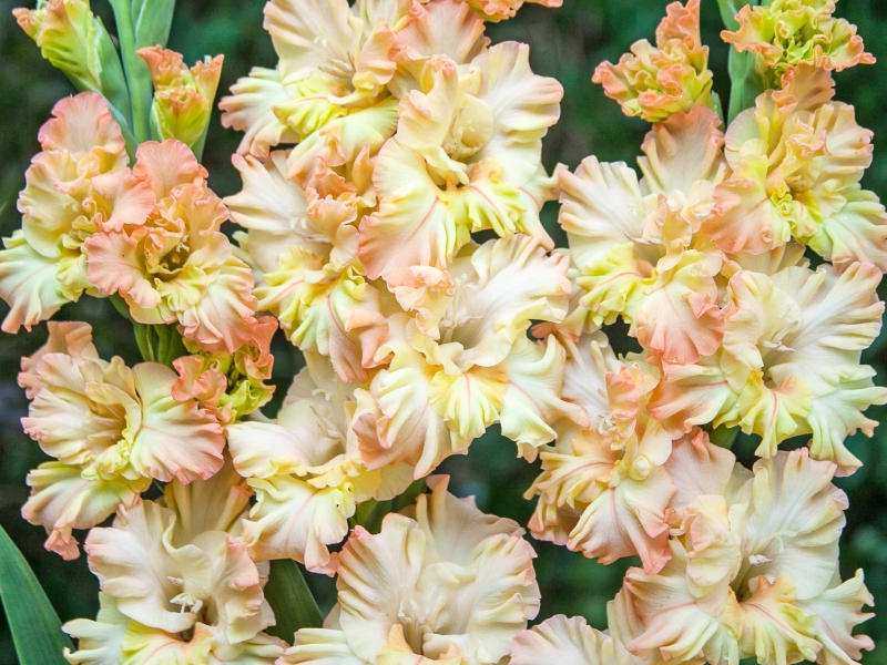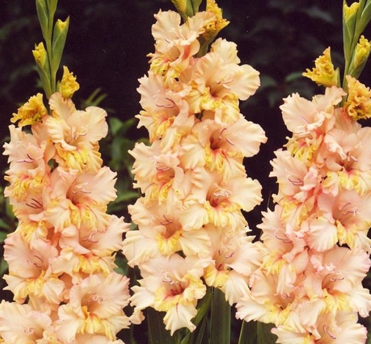 Цветонос этого гладиолуса гибридного Румба Фриззл (Rumba Frizzle) очень надежен, он достигает высоты 120 сантиметров, каждый цветок несет в себе до 15 бутонов, раскрывающихся в шикарные цветы диаметром в 15 см. Гофрированные и довольно плотные цветы имеют оттенки розового, желтого и сливочного цветов. Растение хорошо смотрится на отдельных клумбах, срезанные цвет сохраняют свежесть долго. С самого начала июня гладиолусы будут обильно цвести – это стабильный и надежный сорт. Стебли плотные и жесткие, простоят в вазе до последнего цветочка. Предпочитает солнечные места, легкую почву. Во время цветения обязателен обильный полив.