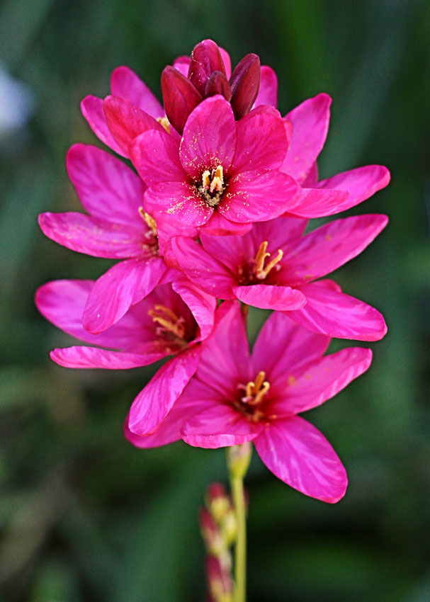 Луковицы иксии гибридной Венус (Ixia hybrid Venus) – очень яркий, зрелищный сорт, который станет цветовым акцентом в композициях и в букетах. Растение не высокое – редко превышает 50 сантиметров в высоту. Кустик не пышный. Листья темно-зеленые, мечевидные, длинные, плотные. Цветки очень яркие, лилово-рубиновые, собраны на длинных медоносах по 6-10 штук. Цветение одноразовое, длится около 3 недель. В срезке цветки сохраняют первоначальный вид на протяжении 2-3 недель. При посадке луковиц, следует выбирать рыхлые почвы, хорошо освещенные участки. В период завязки бутонов и во время цветения необходим регулярный обильный полив.