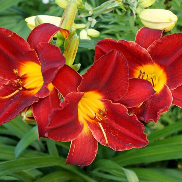 Рассада лилейника Чикаго Апач (Chicago Apache) – великолепное растение с большими цветками, которые составляют раскидистые соцветия по 2 – 10 штук в каждом. На взрослом растении формируется много цветов и благодаря этому сроки цветения значительно увеличиваются. Сами цветки имеют бархатистые лепестки насыщенного красного цвета и гофрированной текстуры с ярким светлым зеленым центром. Листья этого сорта узкие изогнутые и остаются декоративными весь сезон. Цветы появляются на длинных цветоносах. Лилейник Чикаго Апач прост в уходе, для успешного выращивания достаточно высадить его в любую садовую почву с хорошим дренированием. Поливать растение следует только в жаркое время без дождей. Самое обильное цветение осуществляется только при полноценном освещении солнцем.