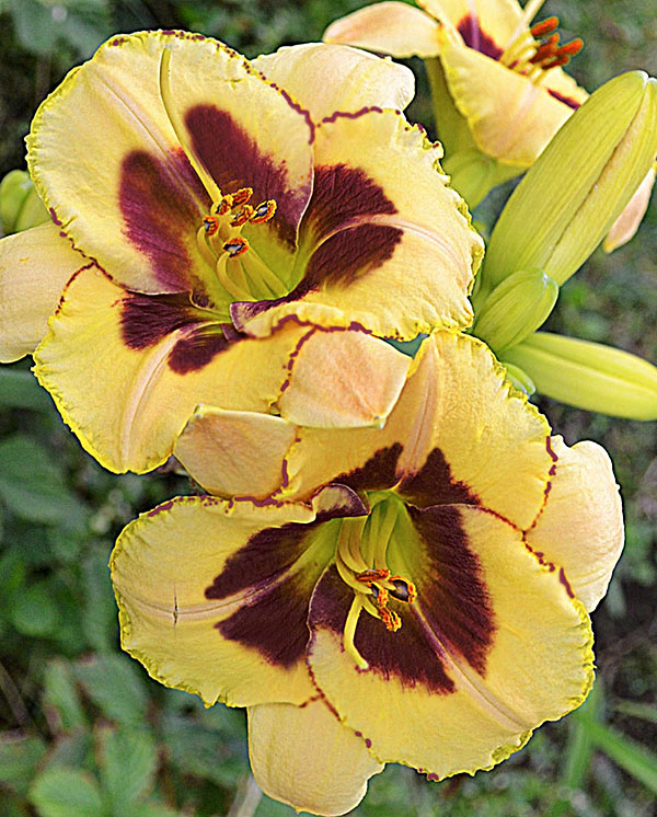 • Окраска цветка : Жёлтая с винно-пурпурным глазком и каймой, жёлтое горло