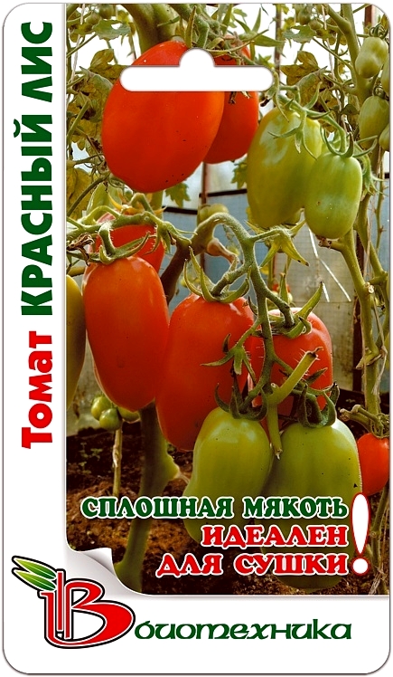 Семена томата "Красный Лис" (Krasnyj Lis) высеваются на рассаду в середине весны. Сорт среднеспелый. Собирать урожай можно приступать спустя 120-130 дней после появления массовых всходов. В тепличных условиях куст может достигать до 200-250 см. Богатый урожай имеет характерный ярко-красный цвет. Плоды сливовидной формы, присутствует центральное ребро. Средняя масса помидоров варьируется от 150 до 170 грамм. Урожай отличается высокими вкусовыми характеристиками, ярким ароматом и прекрасными товарными качествами. Сорт универсален в использовании.